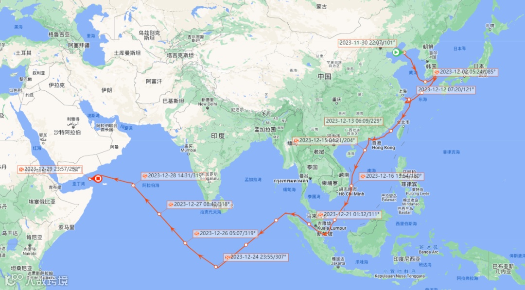 马士基“杭州号”(MAERSK HANGZHOU)服务于亚欧AE12/TP2 PHOENIX/JAGUAR航线,涉及ALIANÇA、MAERSK、MCC、MSC、SEAGO、SEALAND等船公司共舱。11月27日曾挂靠天津港,11月27日曾挂靠大连港,12月8-10日曾挂靠宁波港,12月11-12日曾挂靠上海洋山港,12月14日曾挂靠蛇口港。计划经苏伊士运河,到达埃及塞得和斯洛文尼亚科佩尔等港口。