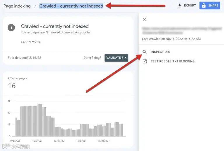 请密切注意“页面”选项卡的索引故障。向下滚动到“已爬网 - 当前未编入索引”报告,查看未在 Google 索引中的页面列表及其原因。该报告通常包括一些非索引页面。但是,如果数量不断增加或超过几个,请检查您的网站是否存在潜在问题。