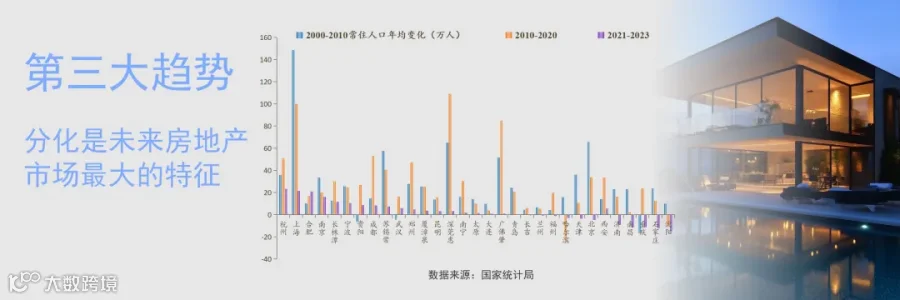 第三大趋势:分化是未来房地产市场最大的特征。未来一二线城市随着人口流入还有较大购房需求。但是,东北、西北及非都市圈城市群的低能级城市,住房供给相对过剩,而且随着人口外迁,未来过剩程度将进一步加深。在城市内部,房地产市场也将进一步分化,未来好城市、好地段、好社区的好房子才是核心资产,硬通货。