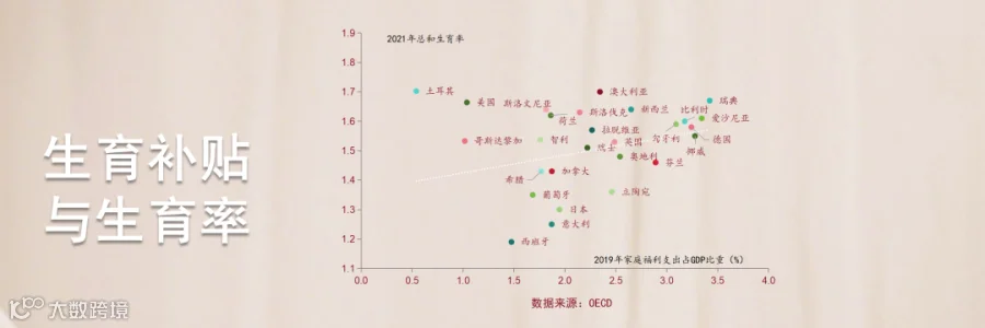 许多发达国家的政府一般会拿出GDP的1%-3%来提供现金补贴、税收优惠等家庭福利,补贴力度大的国家,生育率一般也更高。比如根据OECD数据,北欧国家家庭福利支出占比2%以上,普遍高于南欧和东亚国家,生育率也相对较高,2021年生育率北欧1.58、南欧1.33、东亚1.17。