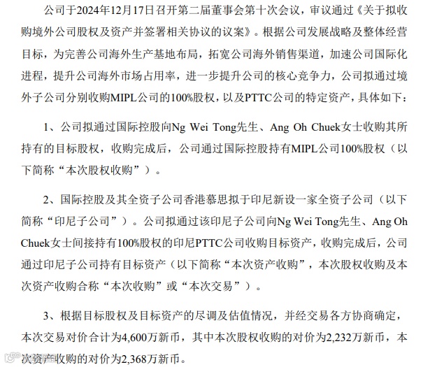 12月17日晚间,慕思股份发布公告称,公司拟通过全资子公司慕思国际控股有限公司及慕思寝具(香港)有限公司以现金合计4600万新加坡币(折合人民币2.48亿元),分别收购MIPL公司(系一家新加坡公司)100%股权,以及PTTC公司(系一家印度尼西亚公司)的特定资产。