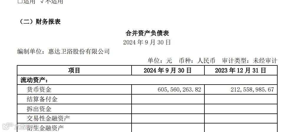 截至2024年9月30日, 惠达卫浴货币资金6.06亿元,较截至2023年12月31日的2.13亿元,增加3.93亿元。