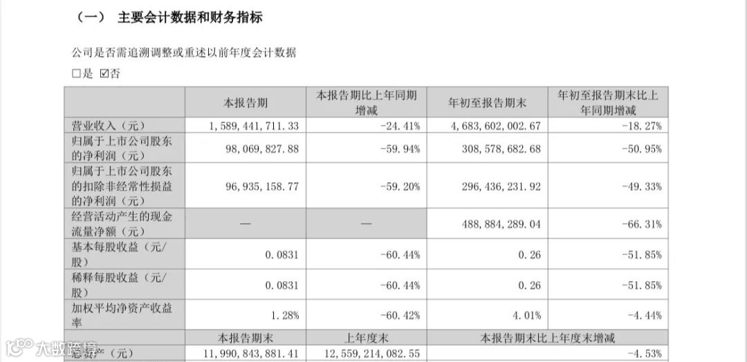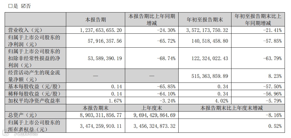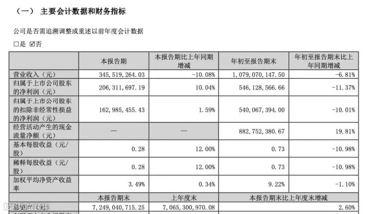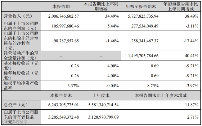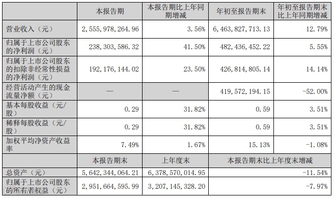 第三季度归属于上市公司股东的净利润约2.38亿元,同比增长41.5%。前三季度归属于上市公司股东的净利润约4.82亿元,同比增长5.55%。