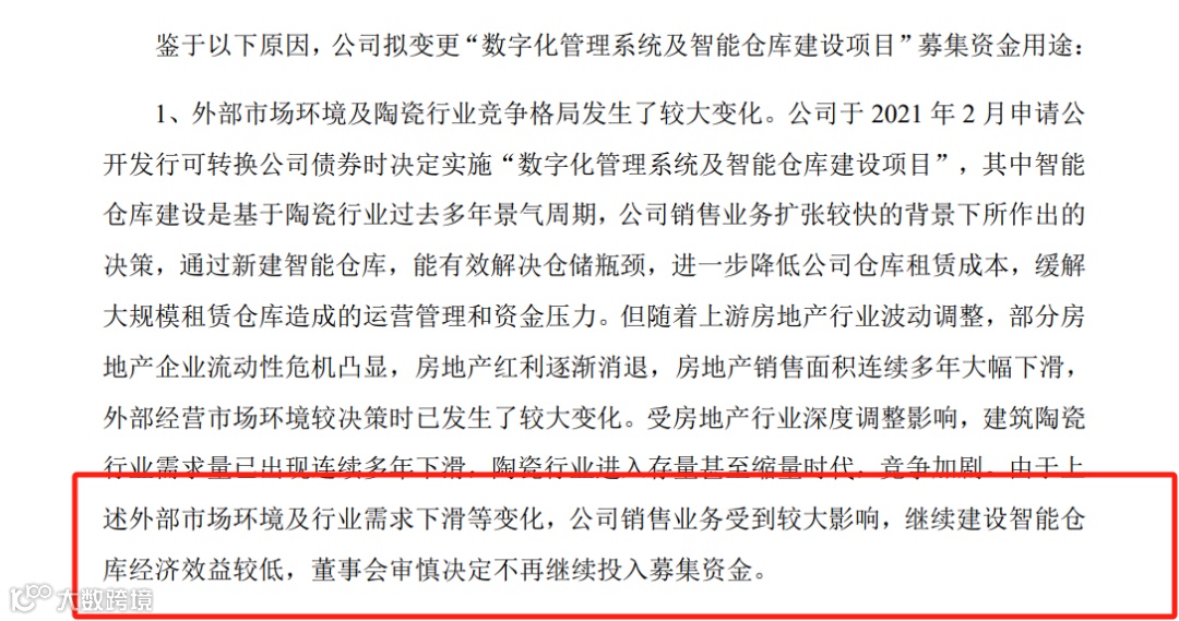 蒙娜丽莎曾表示,由于外部市场环境及行业需求下滑等变化,公司销售业务受到较大影响,继续建设智能仓库经济效益较低,董事会审慎决定不再继续投入募集资金。