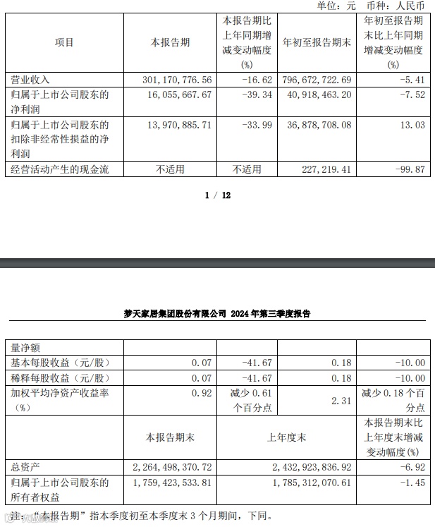 梦天家居(603216.SH)公布三季度报告,前三季营业收入7.97亿元,同比下降5.41%,净利润4091.8万元,同比下降7.52%,扣非净利润3687.87万元,同比增长13.03%,基本每股收益0.18元。