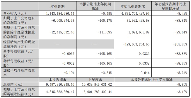 第三季度归属于上市公司股东的净利润亏损约600.59万;前三季度归母净利润约3199.25万元,同比减少88.87%。