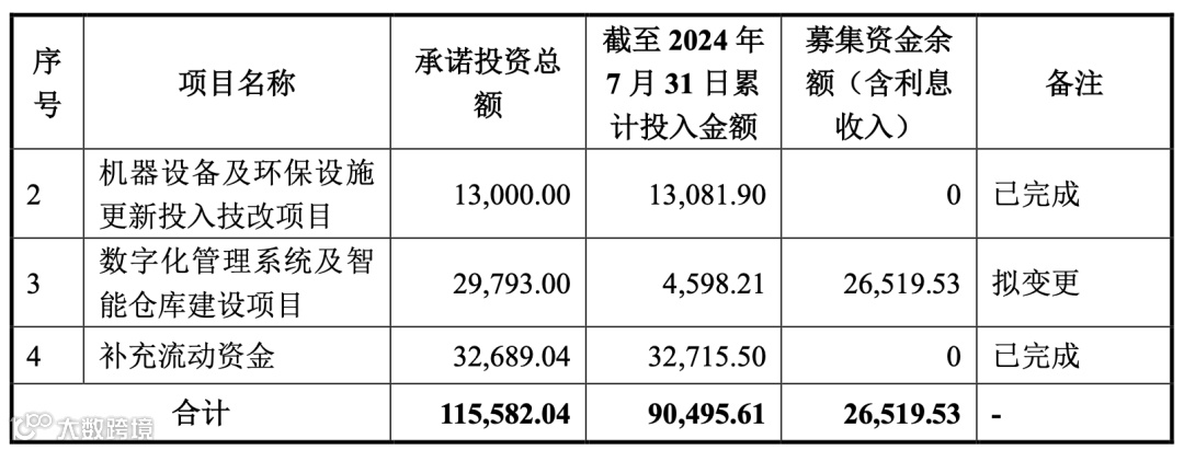 据悉,该“数字化管理系统及智能仓库建设项目”原计划总投资2.98亿元,截至2024年7月31日,项目累计使用募集资金金额4598.21万元,投资进度为15.43%,主要用于数字化管理系统软件及硬件设备等支出。