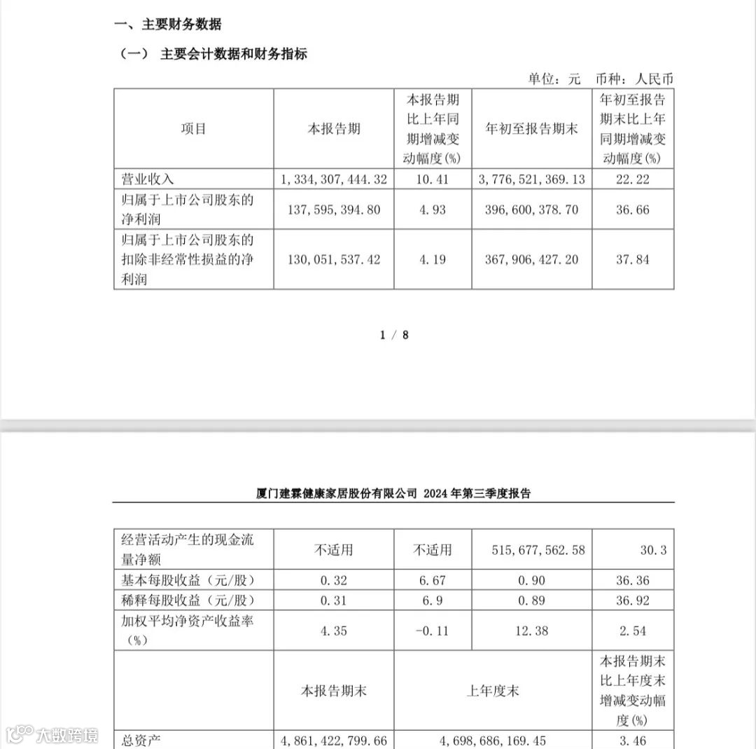 建霖家居:营业收入约为37.8亿元人民币,同比增长22.22%;净利润为3.97亿元人民币,同比增长36.66%