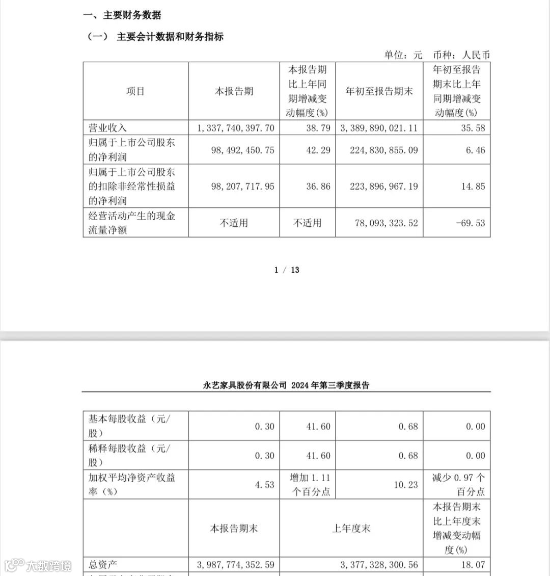 在2024年第三季度,永艺股份实现营业收入约为13.4亿元人民币,同比增长38.79%;年初至报告期末,公司营业收入约为33.9亿元人民币,同比增长35.58%。归属于上市公司股东的净利润在第三季度为9,849万元人民币,同比增长42.29%;年初至报告期末,该数值为2.2亿元人民币,同比增长6.46%。