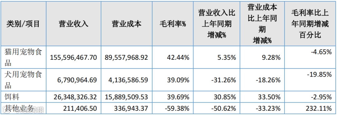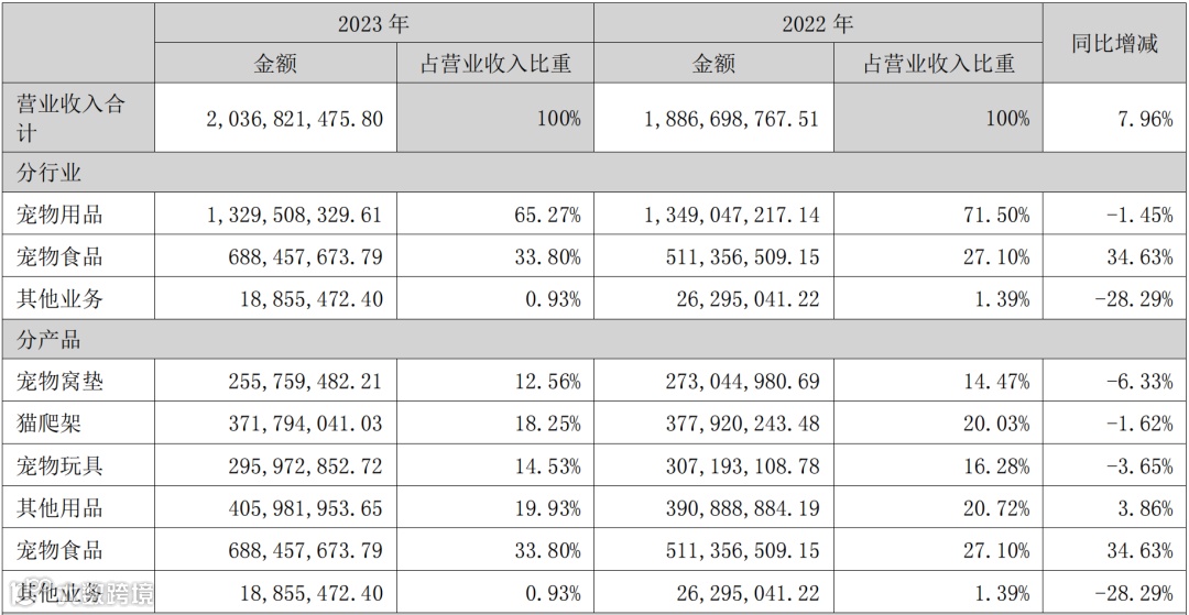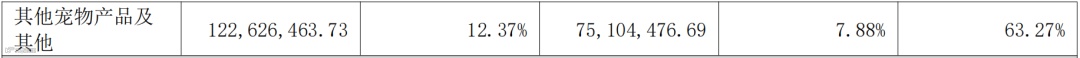 宠物保健品及用品营收5665万元,占总营收1.31%,同比2022年增长54.40%;其他业务收入1667万元,占总营收0.39%,同比2022年下降9.31%。
