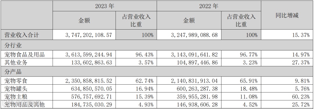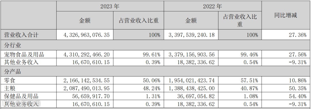 分产品来看,乖宝宠物零食营收21.66亿元,占总营收50.06%,同比2022年增长10.86%;宠物主粮营收20.87亿元,占总营收48.24%,同比2022年增长50.35%;