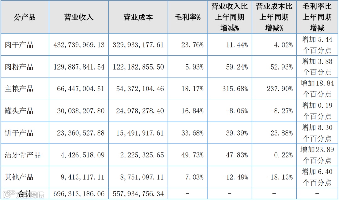 按产品品类划分,肉干类产品营收4.32亿元,同比增长 11.44%,占主营业务收入比重62.78%;肉粉产品营收1.29亿元,同比上升 59.24%,占主营业务收入比重18.84%;主粮产品营收6644万元,其中境外收入1328万元,收入同比上升 315.68%,占主营业务收入比重达到 9.64%;罐头产品营收3003万元,收入同比下滑8.06%,占主营业务收入比重为4.36%,主要受部分境外客户采购下滑影响,境内收入增长26.46%;饼干产品营收2336万元、洁牙骨产品营收442万元,两类产品收入也实现了大幅增长,但收入比重仍然较低。其他产品营收941万元。