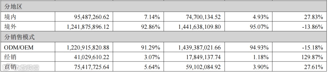 分地区来看,依依股份境外营收12.41亿元,占总营收92.86%,同比2022年下降13.86%;境内营收9548万元,占总营收7.14%,同比2022年增长27.83%。