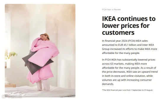 2024财年,宜家推行了广泛的降价措施。英特宜家集团首席执行官Jon Abrahamsson Ring表示宜家大幅降低了63个市场的商品价格,使宜家的商品对许多人来说更加实惠,降价商品涉及卧室、客厅、厨房等多场景家具,部分宜家食品也进行了降价。