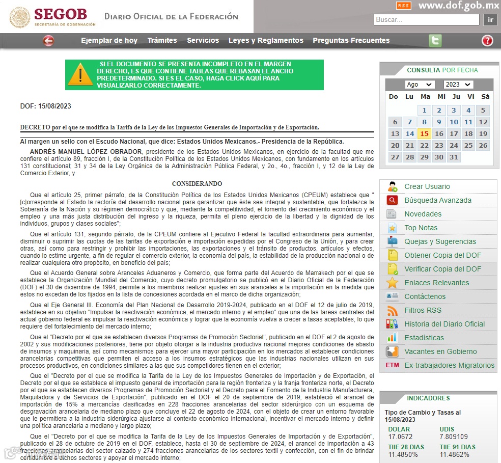 据报道,8月15日,墨西哥总统签署《关于修改一般进出口关税法行政命令》,自8月16日起将上调钢材、橡胶、玻璃、纺织品、陶瓷等多种产品进口关税。