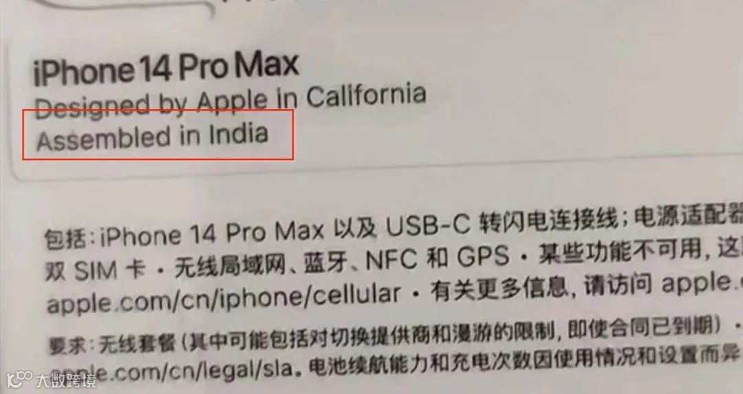 据了解,2022年苹果手机的生产组装中,中国市场的份额为96%,印度紧随其后,约占4%左右。但从去年9月开始,越来越多的消费者发现,他们买到的iPhone 14 系列包装盒上印着“Assembled in India”的字样。这意味着,最新款的苹果手机正在由印度生产制造。