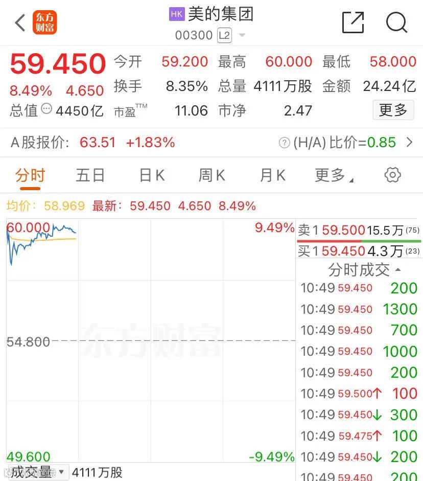 9月17日,家电龙头美的集团在香港联合交易所主板挂牌上市,股票代码为00300.HK,开盘股价报59.2港元/股,相比于发行价54.8港元/股,上涨8%,随后股价一度涨超9%,截至下午13时,仍涨超8%,总市值一举突破4400亿港元大关。