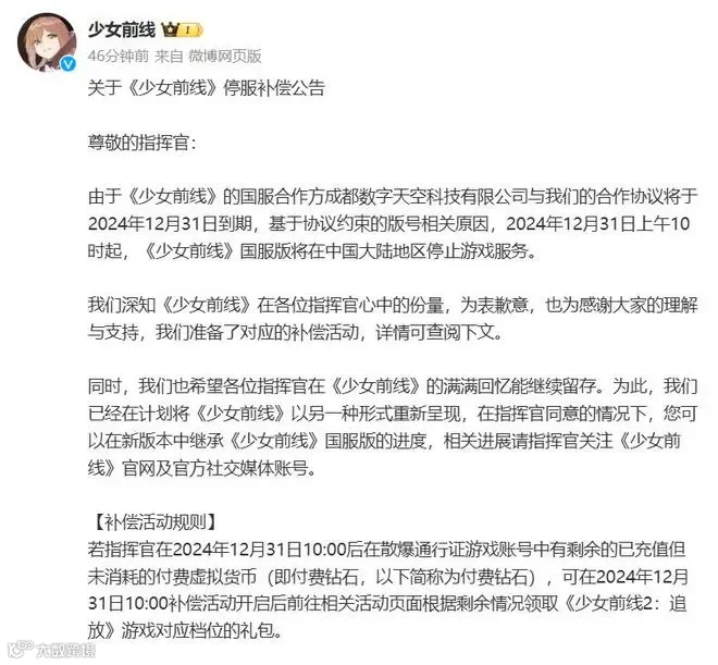 《少女前线》游戏制作组 10 月 30 日晚发布停服补偿公告,由于《少女前线》的国服合作方成都数字天空科技有限公司与制作组的合作协议将于 2024 年 12 月 31 日到期,基于协议约束的版号相关原因,2024 年 12 月 31 日上午 10 时起,《少女前线》国服版将在中国大陆地区停止游戏服务。