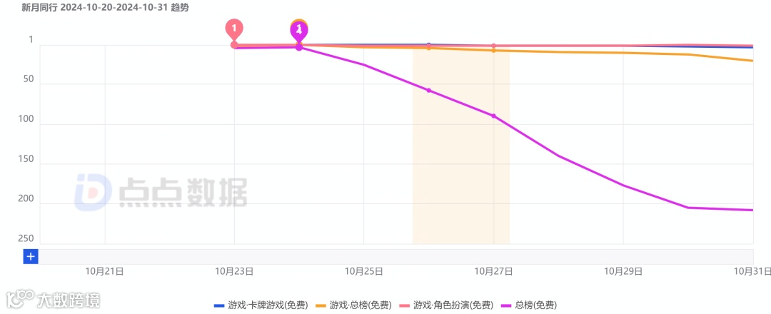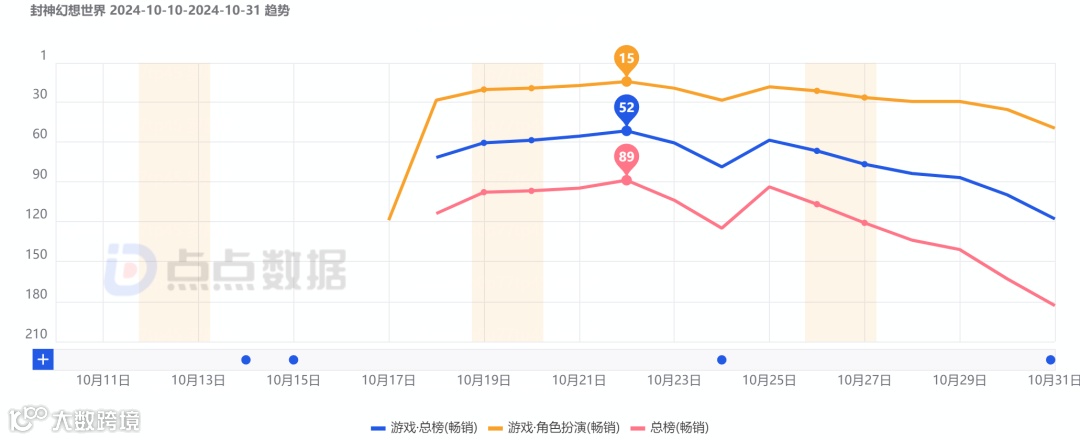 10月16日,雷霆游戏旗下中国神话题材、横竖屏可切换的3D技能斗法回合制手游《封神幻想世界》上线发布并于18日正式开启公测。点点数据显示,产品于发布预下载次日冲上所属类别游戏免费榜第二,但在随后几日内排名出现了较为明显的下滑并跌出免费榜总榜。畅销榜成绩方面则相对稳定,截至10月底,游戏在App Store所属分类、游戏总榜乃至畅销榜总榜都保持了较为稳定的排名浮动,可见游戏的品质得到了下载用户的认可。