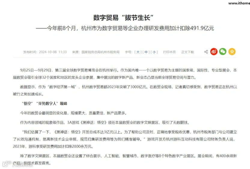 《黑神话:悟空》开发总成本3亿元以上,游戏科学2023年享受研发费用加计扣除2800余万元