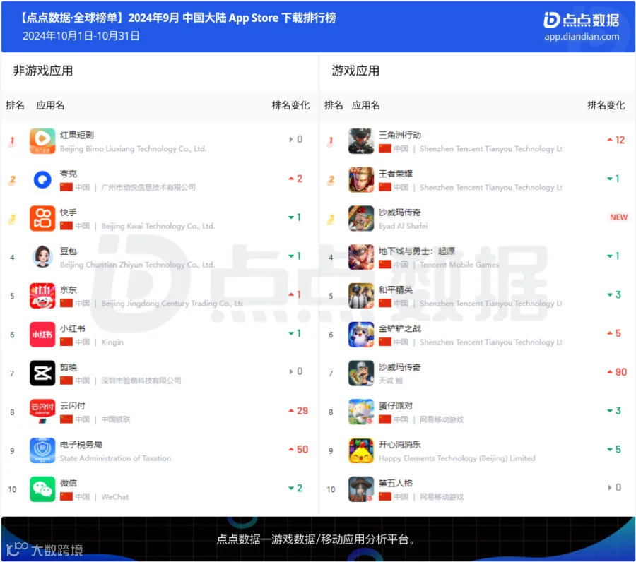 腾讯旗下FPS经典IP同名力作《三角洲行动》上线次月登顶手游下载冠军,十月下载量超过643万;土耳其烤肉卷饼店模拟经营手游《沙威玛传奇》迎来中国版正式上线,该游戏继而冲进下载榜前三,而由国内个人开发者发行的模仿版本也上榜前十。