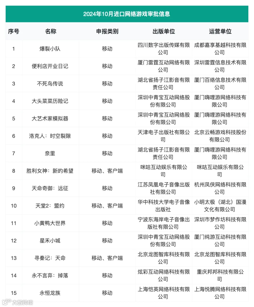 此外,版署更新了《2024年进口网络游戏审批信息》,新增15款游戏过审,包括《爆裂小队》、《胜利女神:新的希望》、《洛克人:时空裂隙》、《不死鸟传说》等。