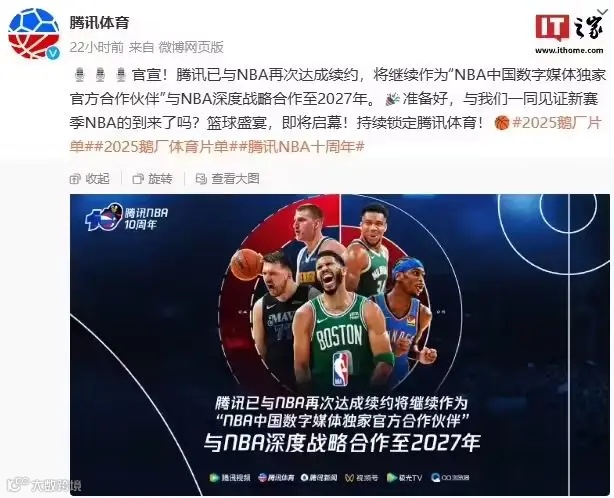 10 月 19 日消息,腾讯体育官宣与 NBA 再次达成续约,将继续作为“NBA 中国数字媒体独家官方合作伙伴”与 NBA 深度战略合作至 2027 年。