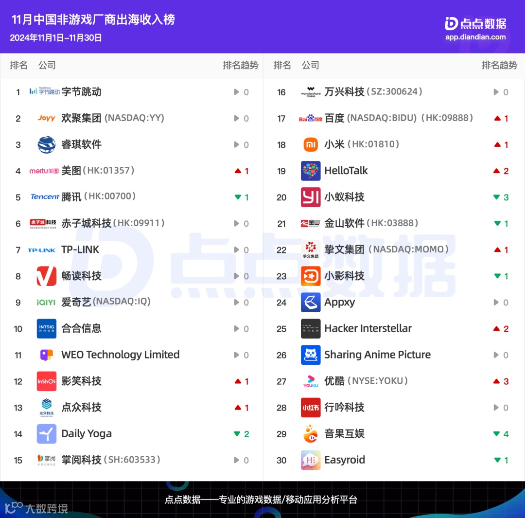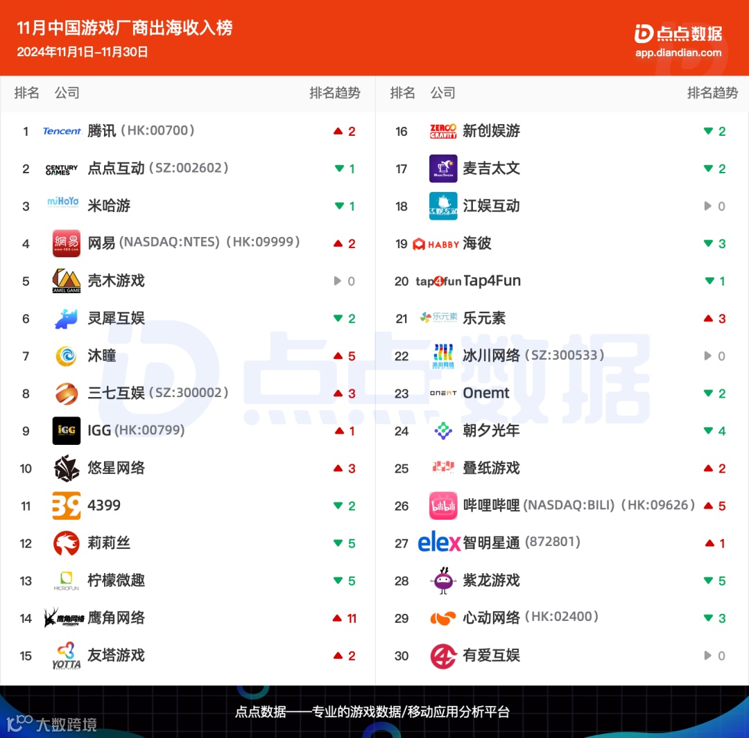 十一月一众国内厂商继续在海外市场保持活跃。腾讯(HK:00700)旗下数款产品,包括大逃杀射击游戏《PUBG MOBILE》、《王者荣耀》的海外版本《Honor of Kings》以及黑马射击二游《GODDESS OF VICTORY》等产品的海外收入数据近乎都在年底实现明显增幅,其中尤以后者数据增幅最为显著,其环比增幅达到了近304.4%。因而也是帮助其厂商重返榜首之位。上月网易(NASDAQ:NTES)旗下策略游戏《第五人格》海外版本及港澳台版本同时迎来新剧情版本的更新以及与女神异闻录的IP联动第二弹活动,使得该游戏的海外收入迎来数据峰值,其数据环比上浮超过40%,继而推动其厂商上月排名重返前五。沐瞳上月海外收入也在旗下旗舰MOBA游戏《Mobile Legends: Bang Bang》的数据增幅推动下上涨近10%,排名升至第7位。榜单中部厂商中,鹰角网络旗下TD策略游戏《Arknights》在新章节剧情的更新后在日美韩三个主要收入来源地区的数据皆是迎来了超越翻倍的增长,最终帮助其厂商上月海外收入数据提高超过139.5%,排名也是一举升至第14位。乐元素旗下偶像养成玩法音游的日服版本《あんさんぶるスターズ!!Music》上月在日本市场的收入增幅超过20%,成为其厂商上月排名增幅的主要原因。哔哩哔哩(NASDAQ:BILI)负责全球代理发行的知名动漫IP“咒术回战”改编的手游国际服版本《Jujutsu Kaisen Phantom Parade》上月正式在全球范围内上线并凭借IP影响力取得不错反响。其上线首月取得的数据成绩成为其厂商海外收入增幅超过35%的关键所在。此外,上月排名上升的还有三七互娱(SZ:002555)、IGG(HK:00799)、悠星网络、友塔游戏、叠纸游戏和智明星通。