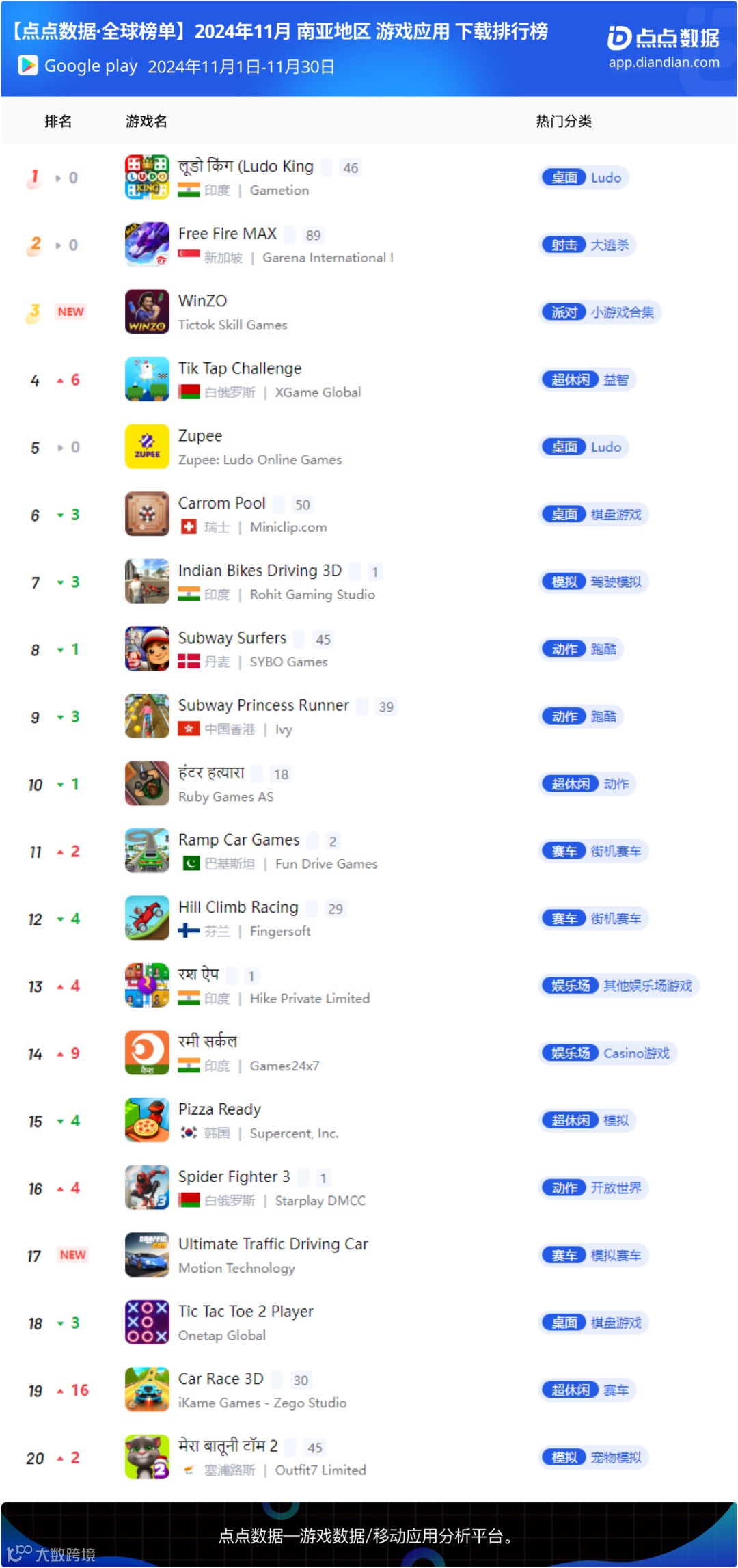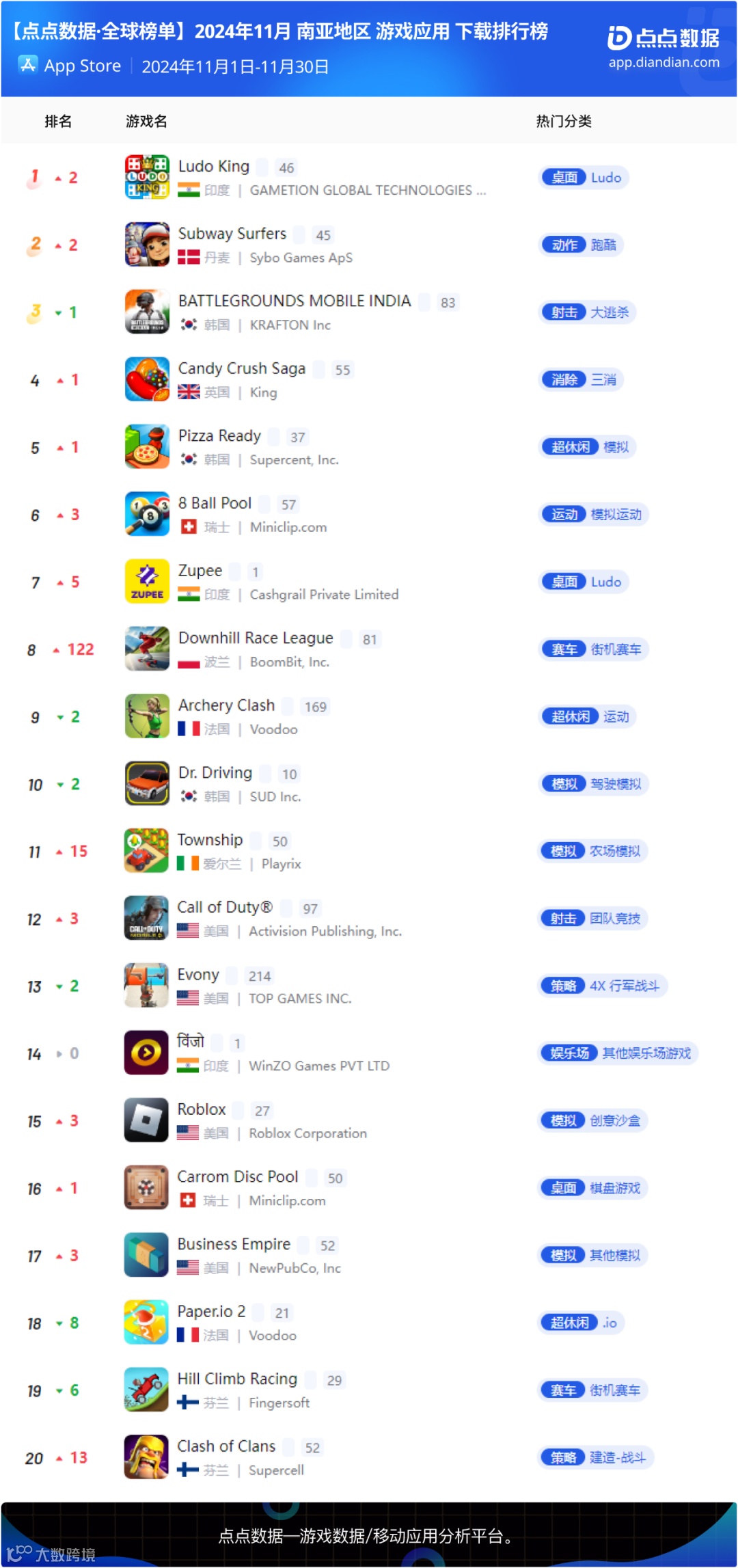 统计周期内,南亚地区手游下载冠军继续由本土Ludo战棋社交休闲游戏《Ludo King™》蝉联,其十一月总下载量超过1467万,环比此前一个月再次下滑近8.2%,但该游戏在App Store手游下载榜的排名则是重返榜单第一。