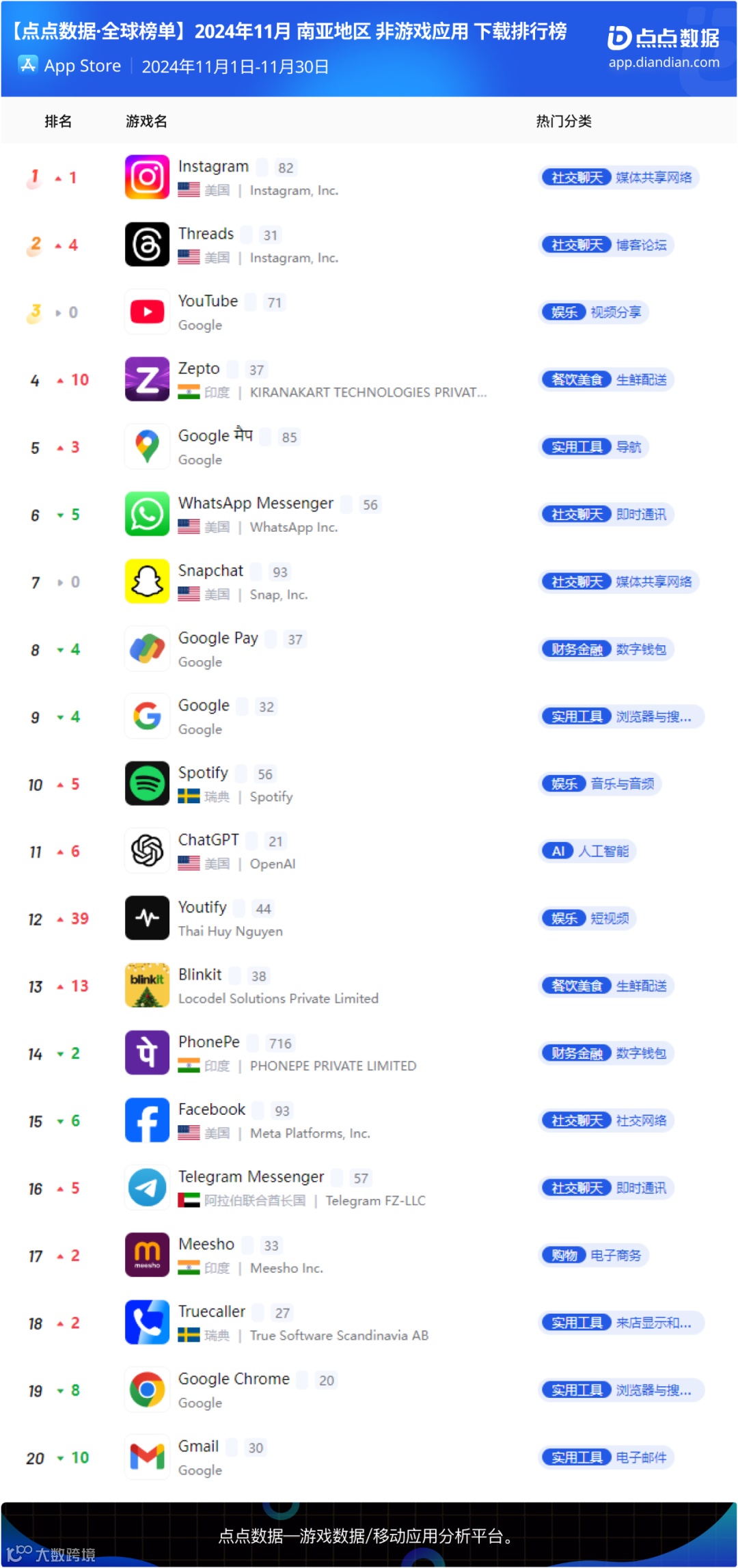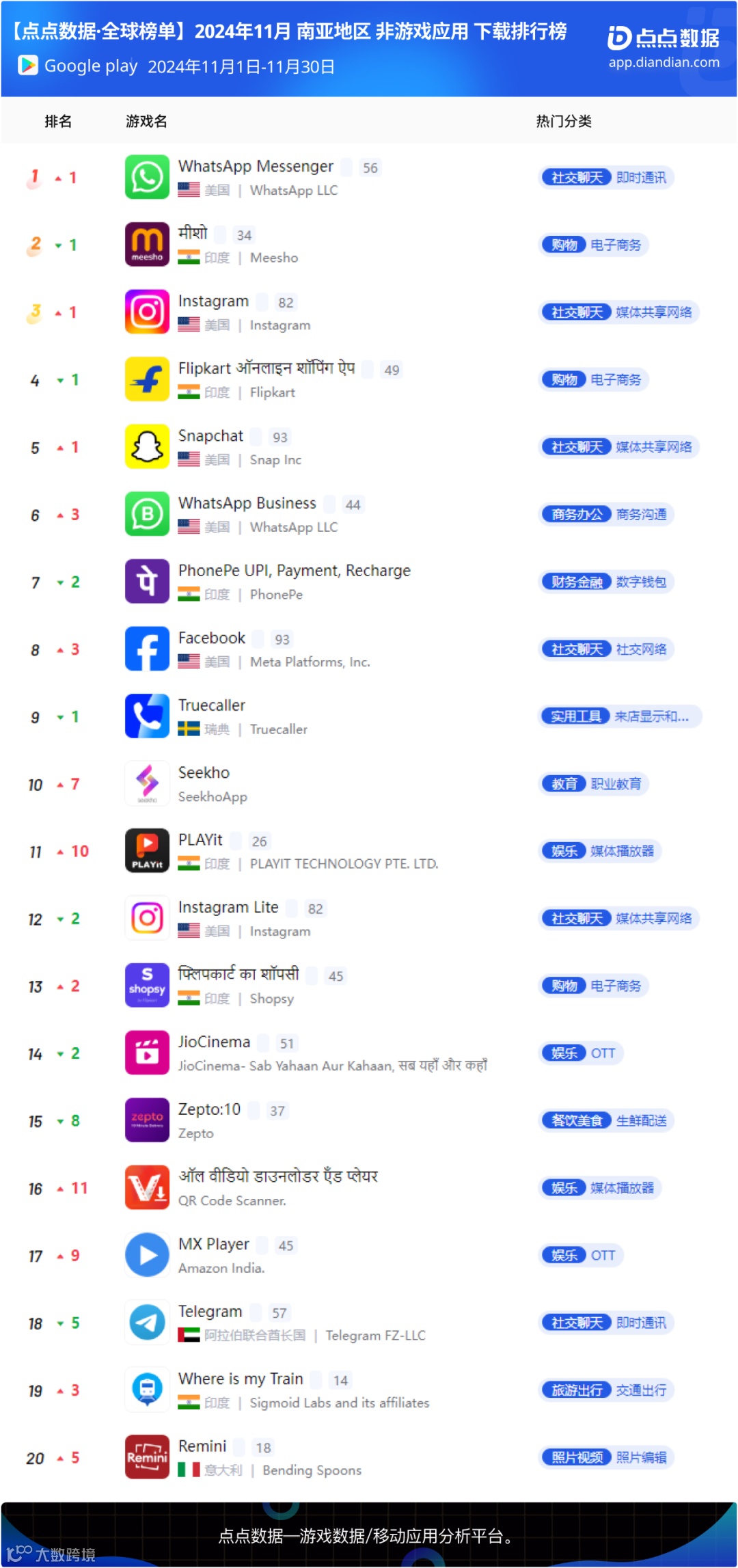 统计周期内,十一月南亚地区非游应用下载冠军由Meta旗下即时通讯聊天社交应用《WhatsApp Messenger》凭借Google Play平台下载数据的领先优势摘得,其十一月在南亚地区的下载总量超过3085万,环比上浮超过26.4%。App Store这边的下载榜头名则依旧为同公司旗下图片社交应用《Instagram》所蝉联,其单平台下载量超过151万。