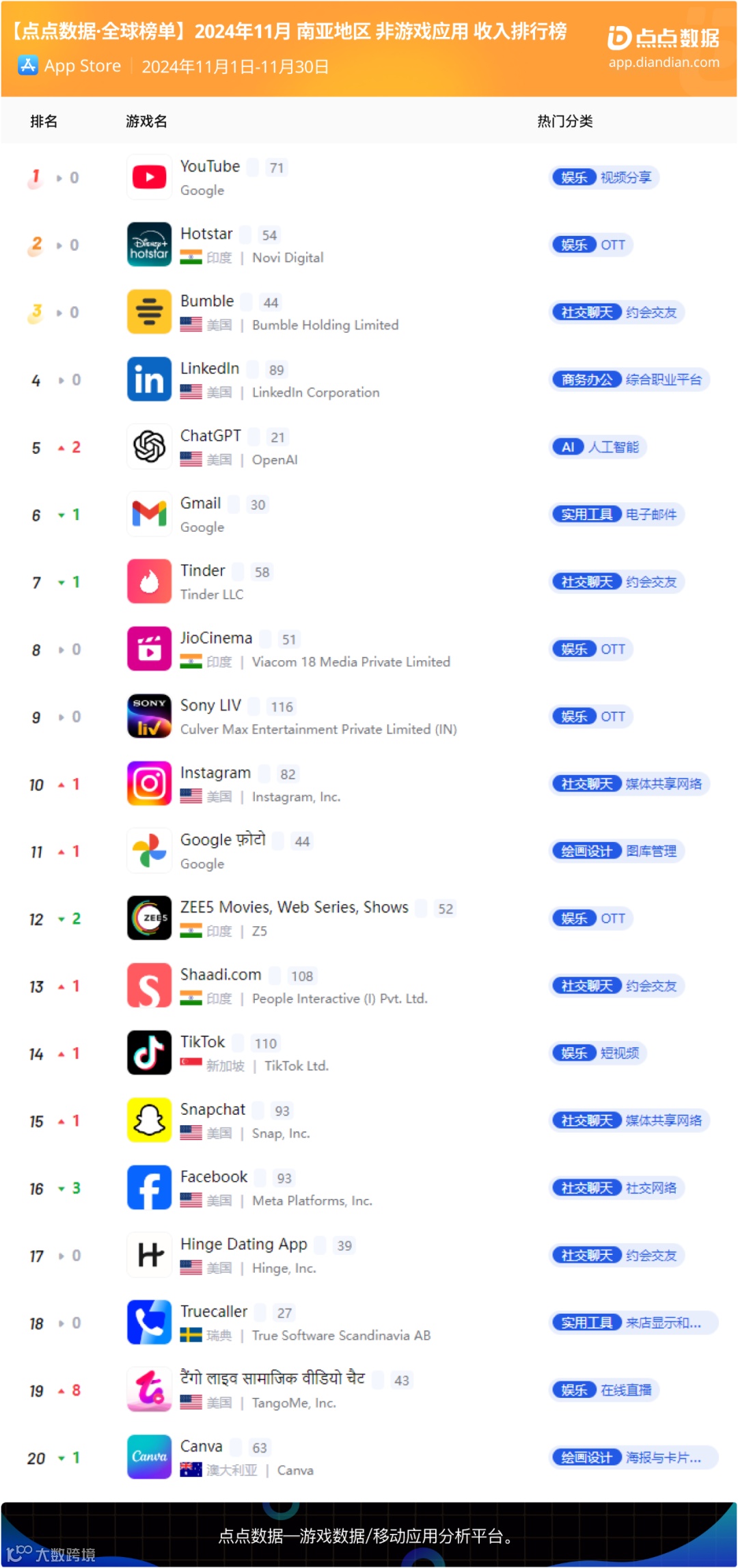 十一月南亚地区非游应用收入冠军再次由谷歌官方办公应用《Google One》蝉联,其上月预估收入超过107万美元。App Store这边则继续由视频社交应用《YouTube》摘得应用收入榜冠军,其单平台预估收入超过48万美元。上月上榜应用收入数据皆呈现周期性小幅下滑。
