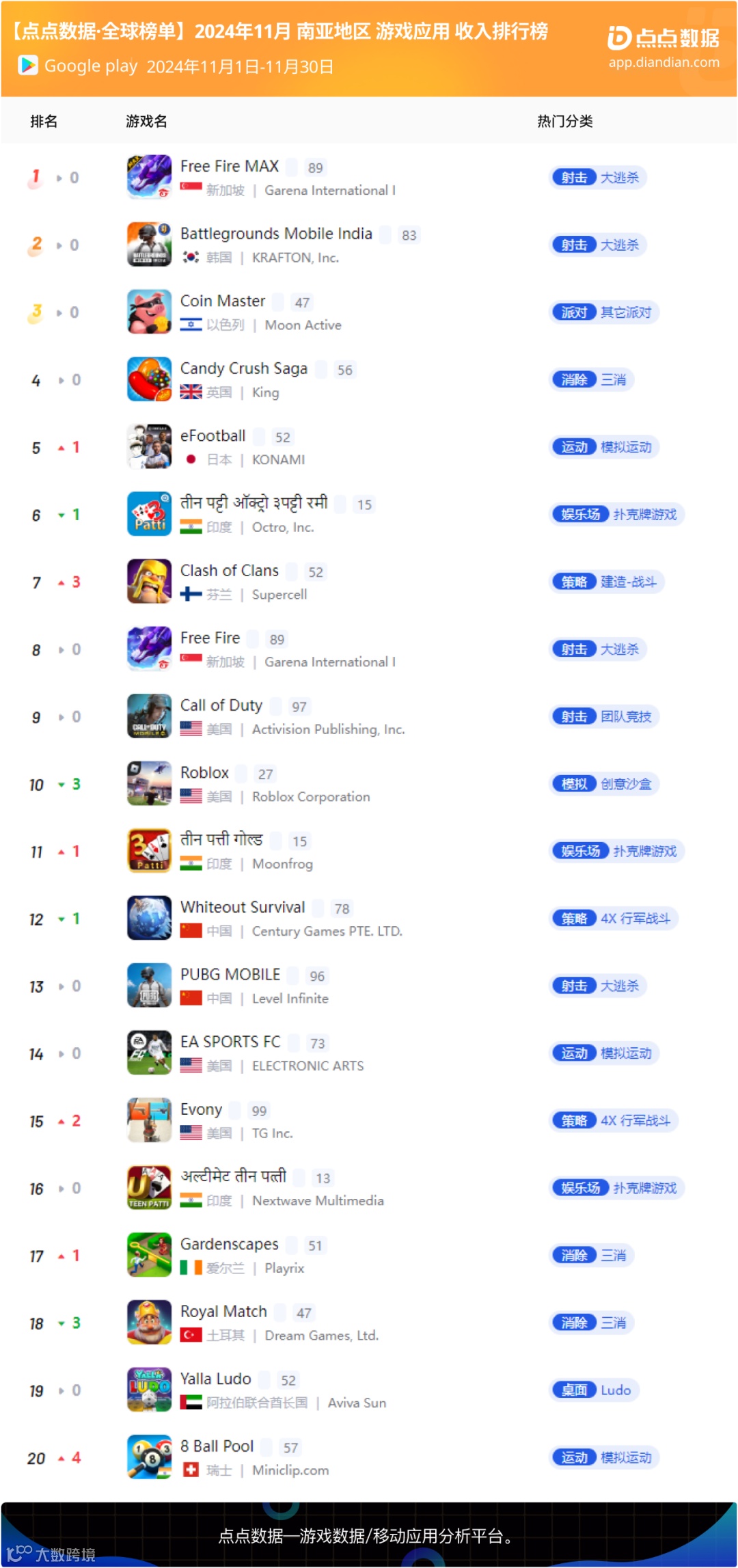 十一月南亚手游收入榜中,Garena旗下大逃杀FPS游戏画质增强版本《Free Fire MAX》继续凭借Google Play单平台收入数据上的绝对领先优势蝉联手游收入冠军,其预估月收入超过172万美元。而蓝洞运营的PUBG印度版本《BATTLEGROUNDS MOBILE INDIA》则是继续蝉联南亚地区App Store手游收入榜冠军。
