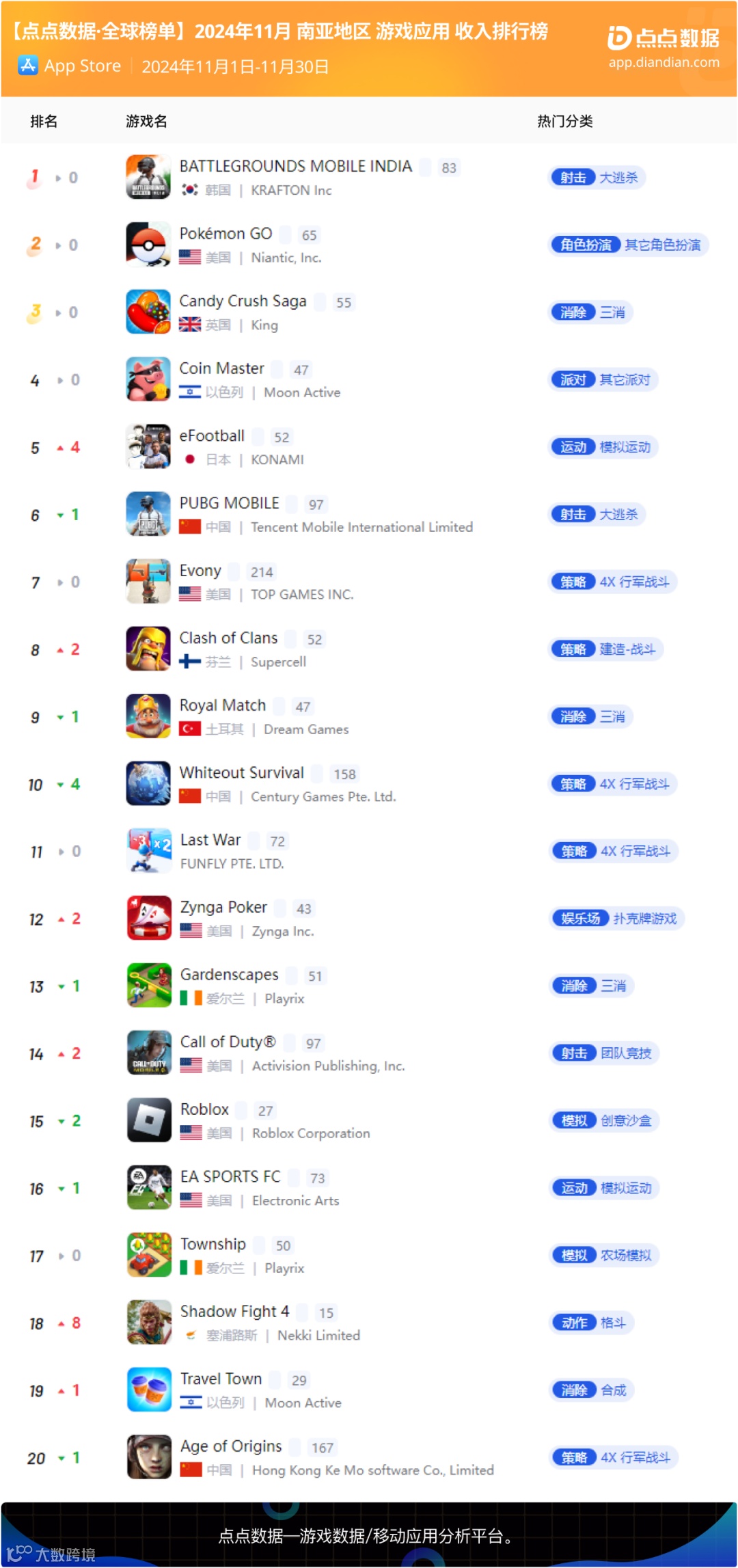 十一月南亚地区手游收入榜上榜游戏排名依旧维持相对稳定的浮动趋势,总体上榜游戏收入数据周期性小幅下滑。其中,科乐美“实况足球”手游《eFootball》双平台收入数据走高,排名双双回到榜单第五。此外,《Clash of Clans》也在下载端增幅的推动下收入数据双双回暖。