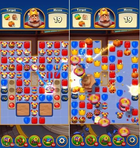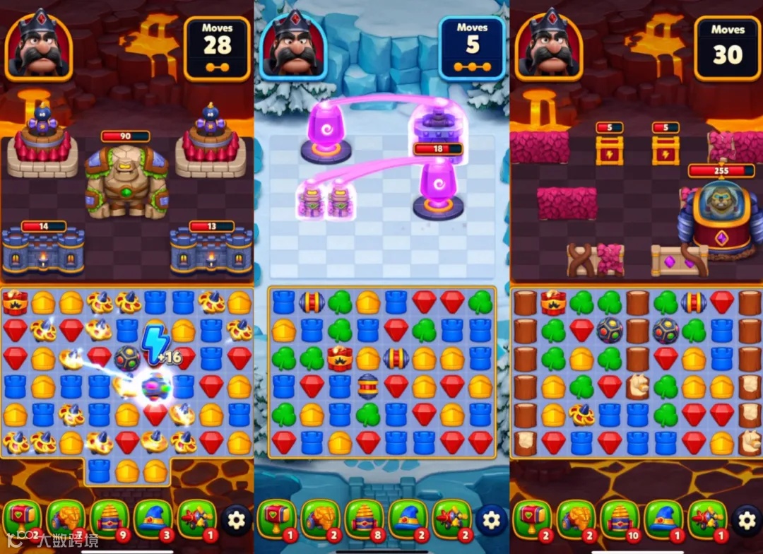 在上述种种现实情况的推动下,今年4月《Royal Kingdom》开始着手大改(同年7月推线上),回归传统关卡制三消,整体体验类似升级版的《Royal Match》。两者在关卡设计、棋子、障碍与道具功能、外围meta玩法机制、活动与LiveOps架构等方面体验一致。