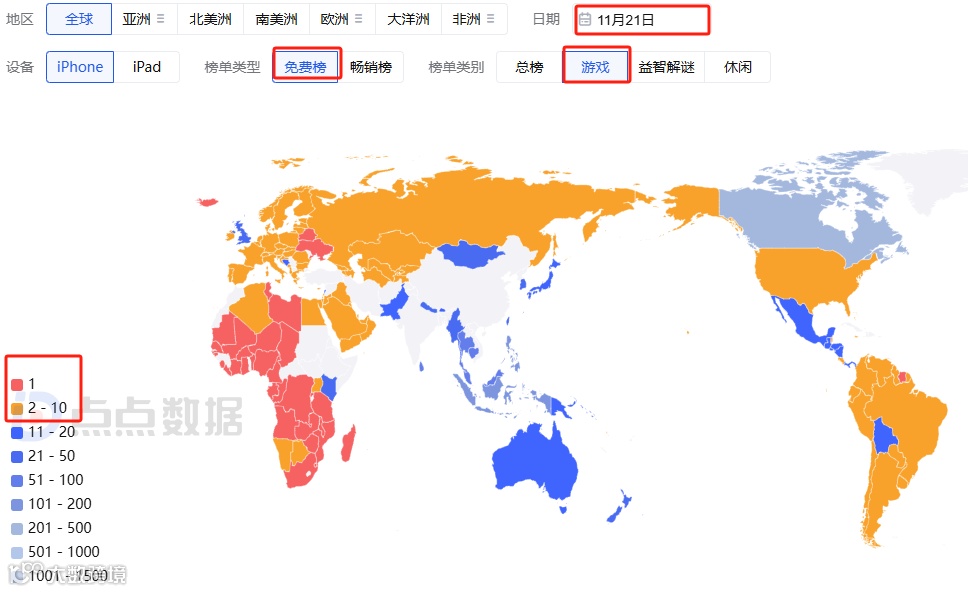 公测当天,该作便登上128个区域市场iOS游戏免费榜TOP10(登顶区域市场为40个),但之后榜单成绩下滑明显。当前(12月10日)其位于6个区域市场游戏免费榜TOP100(位于美国免费榜第10),5个区域市场畅销榜TOP50。