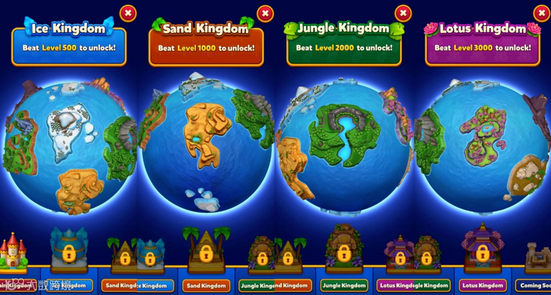 但在背景的设计上,《Royal Kingdom》聚焦在国王Richard对星球上主题王国的开拓与修复上,王国被分为冰雪、沙漠、雨林等多个主题板块,每征服一个板块都需要玩家通过上百个关卡。这样的世界观配合更“粗放”的美术相比前作聚焦在城堡及周边显得更加符合男性审美;