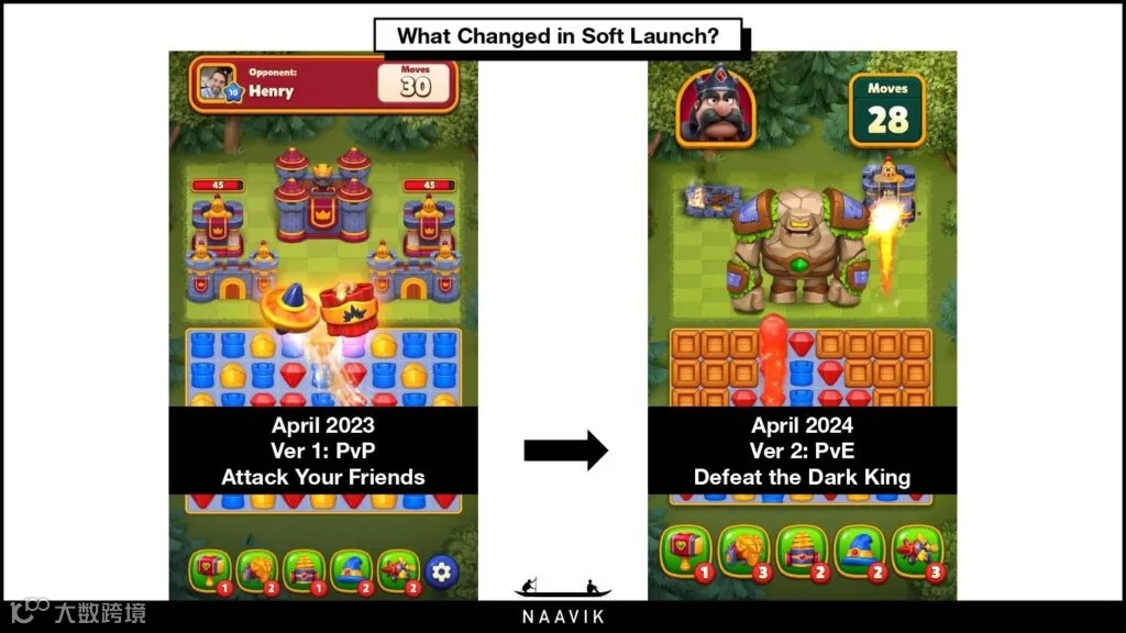海外知名游戏咨询公司Naavik对于《Royal Kingdom》的调整进行了相关总结。早期游戏在三消框架的基础上,以PVP为核心融合类Coin Master的特色循环机制,同时引入社交赌场经济模式。