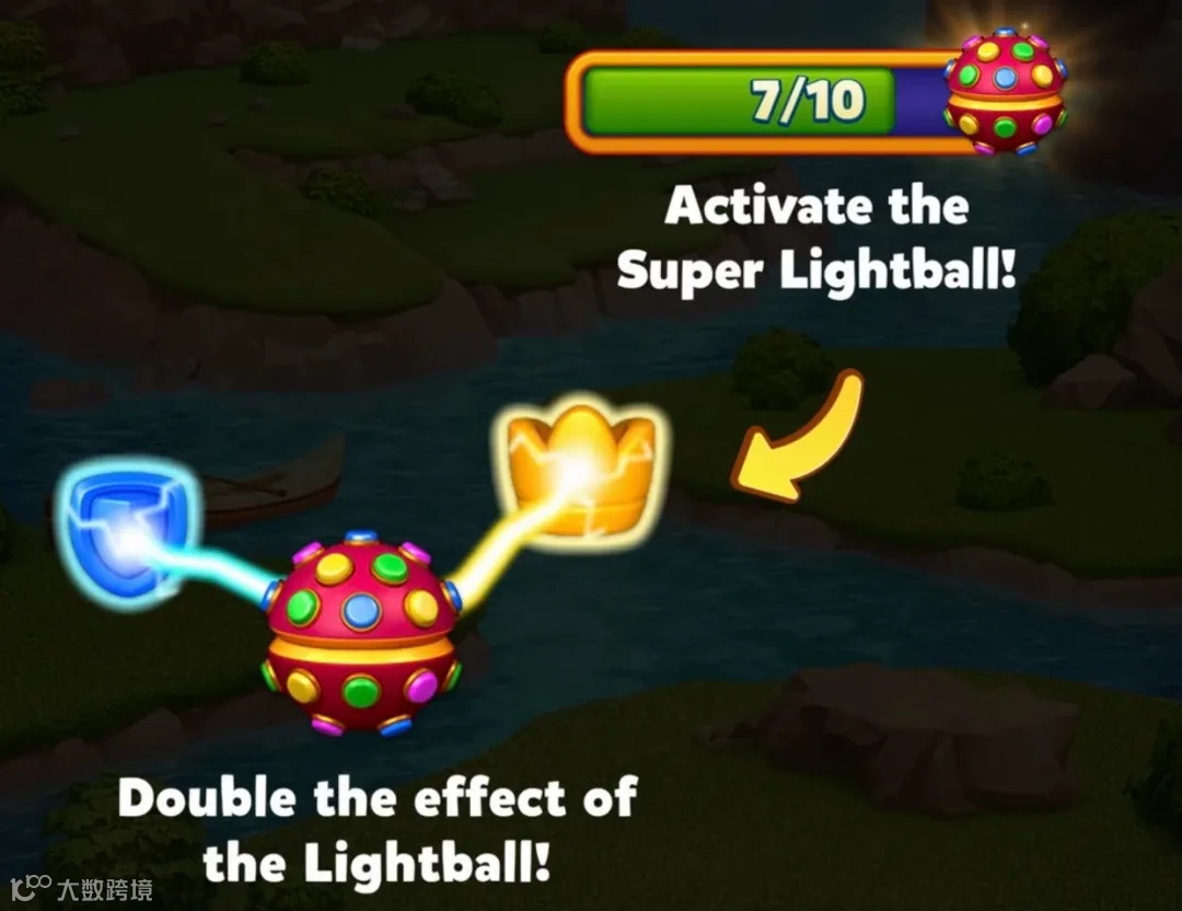 这种情况在2023年发生了变化,这一年游戏对日韩以及繁体中文等亚洲核心市场投放了更多的精力。同年6月又推出了一项名为“Super Light Ball”的强力道具,也就是上文中提到的“超级光球”,其威力巨大能消除棋盘上所有两种颜色的物品,如果与另一种强力道具结合使用,还能将所有两种颜色的物品转化为强力道具,使用该道具玩家需要先赢10个关卡,激活后可以一直使用,直到闯关失败。