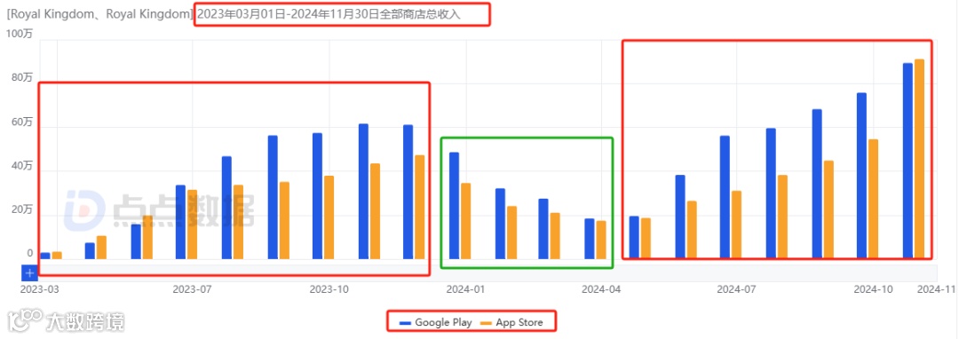 《Royal Kingdom》软启动期间月流水趋势:2023年4月至2024年11月20日