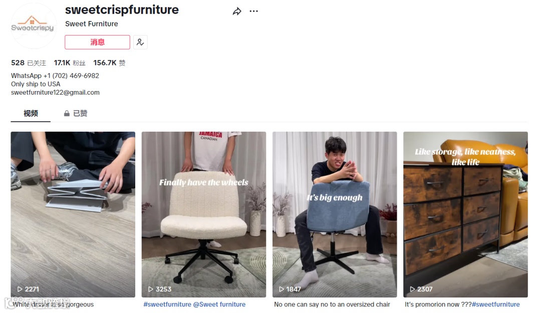 Sweetcrispy高度重视自营社交媒体账号的运营,尤其注重TikTok这一日活跃用户数远超其他平台的推广渠道。品牌选择TikTok作为主要推广平台,并通过官方账号与达人带货相结合的方式进行品牌宣传。其在TikTok的官方账号@Sweetcrispfurniture主要发布展示家具使用方式和场景的视频,为客户提供详尽的产品使用指南。