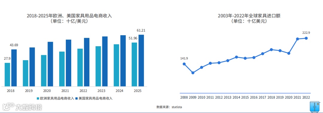全球家具用品市场主要集中在欧洲、美国、中国和日本等国家或地区。美国家具用品电商渠道的收入预计在2025年将达到612.1亿美元,复合增长率约为3.07%;欧洲家具用品电商渠道的收入在2025年预计会达到519.64亿美元,复合增长率为约6.89%。对于出海卖家而言,这两大市场仍然是未来可主攻的地区。2008年至2022年,全球家具进口额也稳步增长,到2022年全球家具进口额高达2229亿美元,全球家具市场的需求和贸易活跃度在不断提高。进口额的增长也反映出全球家具市场的需求和消费能力在不断提升,为家具制造商和出口商提供了广阔的市场空间。