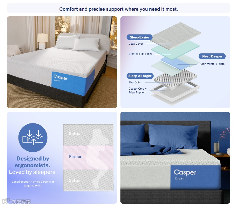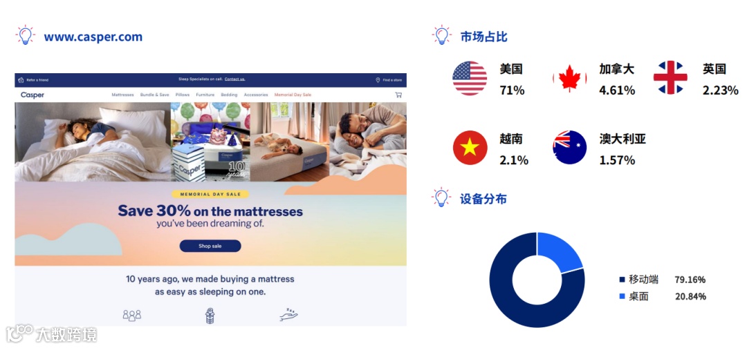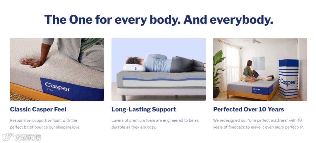 Casper的床垫产品虽然在技术上壁垒相对较低,且产品复制性较强但公司通过深入研究消费者的睡眠习惯和痛点,与消费者建立了强烈的共鸣。Casper团队在产品开发到配送服务的每一个环节都体现了对细节的关注,确保了优质的客户体验。此外,Casper还成功运用了品牌社交媒体营销和KOL营销等现代营销策略,快速确立了其在市场上的独特定位,并通过多渠道营销有效引流,为其独立站汇聚了大量流量,逐渐积累了大批忠实顾客。在床垫市场的长期竞争中持续展现出其品牌魅力。