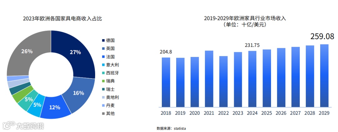 目前德国是欧洲最大的家具市场,家具电商份额占据全欧洲的27%,在德国,极简主义和功能性的家具设计越来越趋于优先考虑质量和可持续性。此外,英国和法国等传统欧洲大国在家具电商市场中也占据了一定的地位。