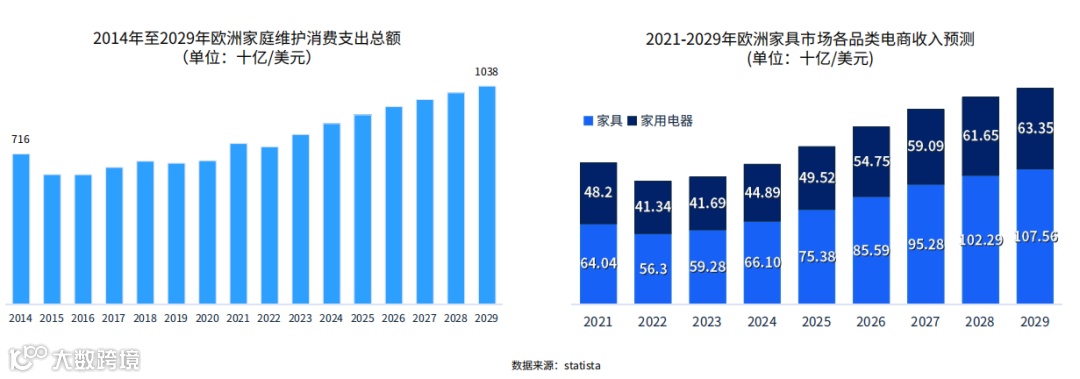 据预测,到2029年,欧洲地区的家庭维护消费总额将达到10377.57亿美元。同时,家具市场的电商收入在2021至2029年间也呈现显著增长,预计到2029年将增至633.5亿美元。随着家庭对于居住环境的舒适度、美观度以及功能性要求的提高,家庭维护消费的增加往往会直接推动家具市场的发展。