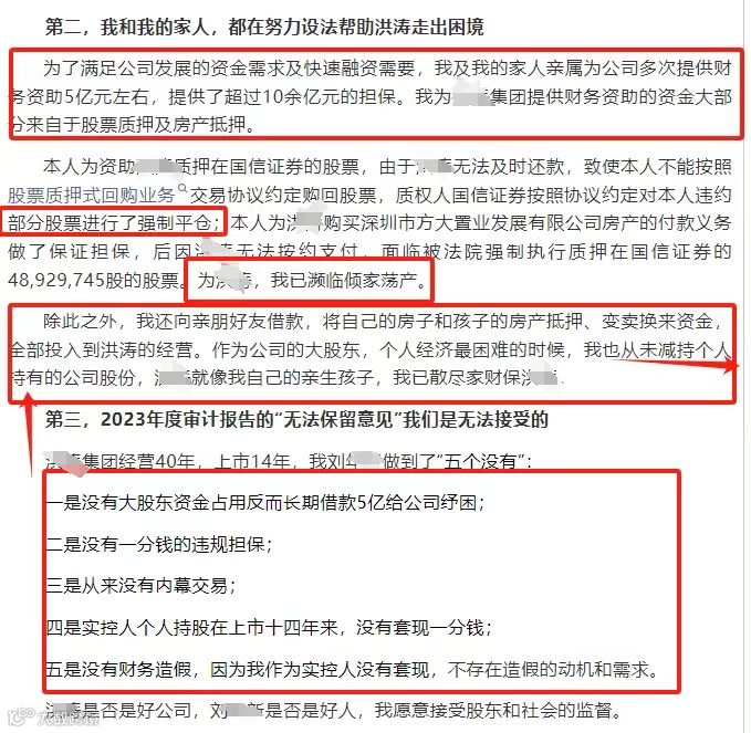 其实在6月16日,洪涛集团董事长已经在公众号发布了一份公开信,这份公开信写的很长,这里面有一点印象深刻,董事长和自己的家人努力为洪涛集团走出困境,里面是这样的写的。