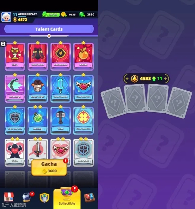 再者是天赋系统,通过消耗金币,玩家可以在四张天赋卡牌中随机抽取一张,相同的两张卡牌可以合二为一进行升阶获得更强的加成。