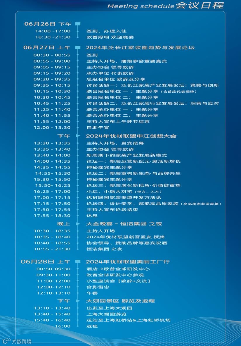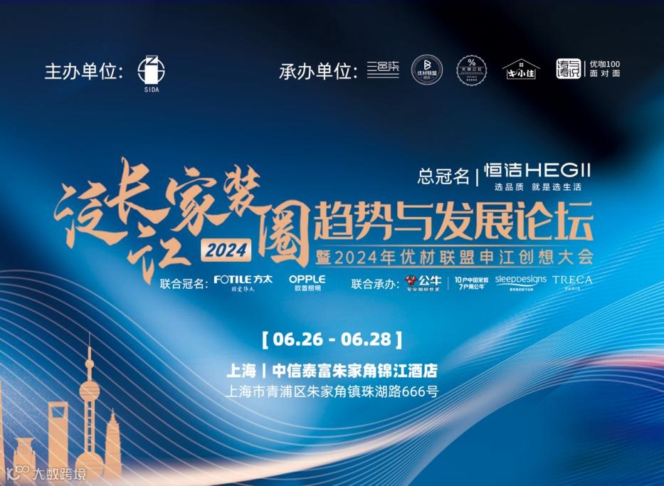 在此背景下,6月26日—6月28日,2024年泛长江家装圈趋势与发展论坛暨2024年优材联盟申江创想大会将于上海·中信泰富朱家角锦江酒店举行,本届峰会旨在搭建一个思想碰撞、资源共享的高端平台,通过主题演讲、圆桌论坛、案例分享等形式,汇聚家装行业的精英智慧,共同探讨如何在变革中寻找新的发展机遇,如何在挑战中实现家装高质量发展。
