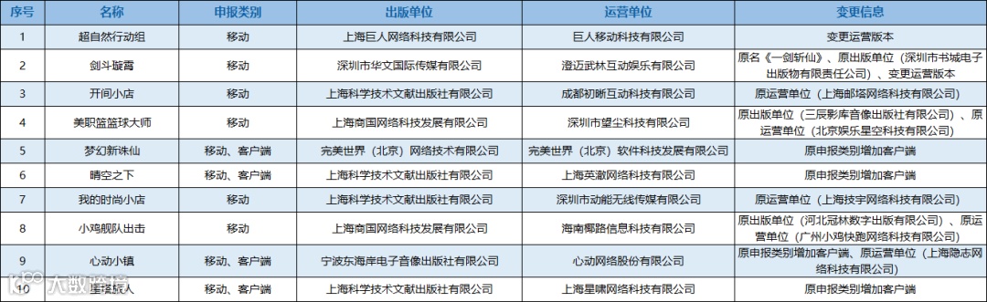 与此同时,版署还新增了10款游戏的审批信息变更,变更时间为9月27日。主要包括巨人网络《超自然行动组》变更运营版本,完美世界《梦幻新诛仙》新增客户端版本。心动公司《心动小镇》新增客户端版本,并且运营单位由上海隐志网络科技有限公司变更为心动网络股份有限公司。