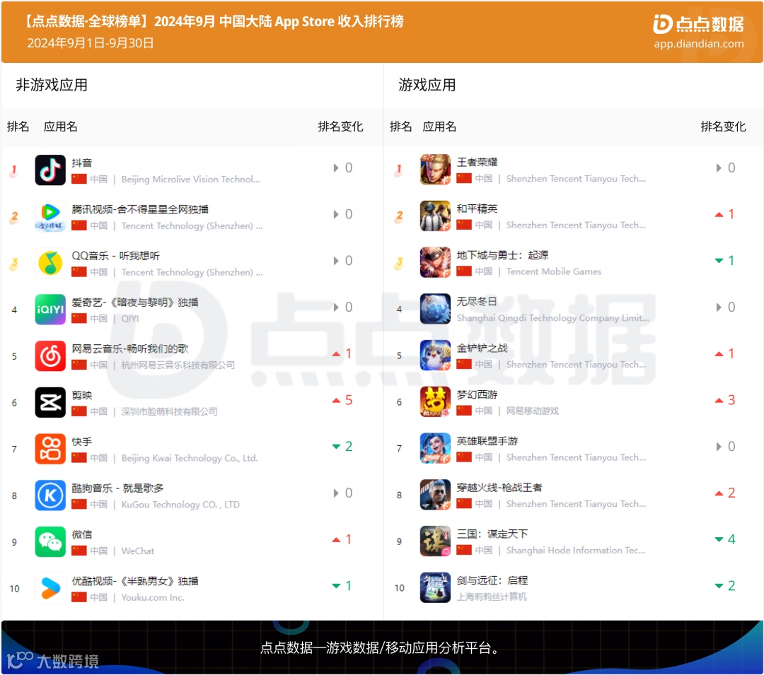 字节旗下多款非游应用下载量显著提升;腾讯旗下六款游戏上榜收入榜Top10