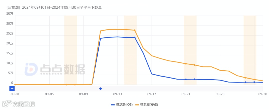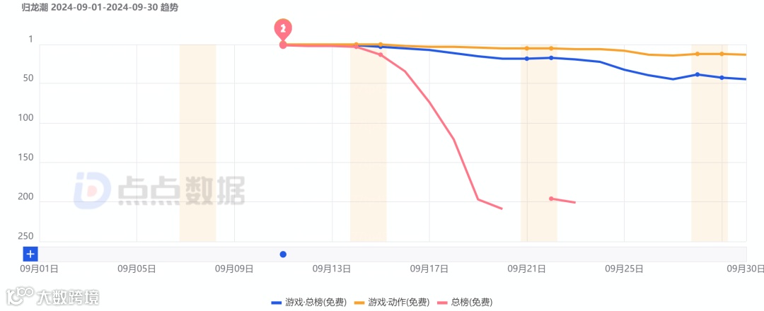 9月11日,FunPlus旗下的龙潮阁工作室开发的国潮动作RPG《归龙潮》正式发布并于13日开启公测。根据点点数据统计,游戏发布预下载首日便空降中国大陆地区App Store游戏分类免费榜总榜,并持续在动作游戏类别免费榜霸榜。与此同时,该作也于正式上线公测的首日冲进动作游戏分类畅销榜的前十。